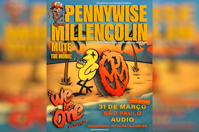 Com a primeira data em São Paulo/SP esgotada em apenas três dias, o We Are One Tour 2026 ganha uma segunda data na capital, resposta direta à grande procura pelo evento. A data extra será dia 31 de março, na Audio, com Pennywise (EUA), Millencolin (Suécia), Mute (Canadá) e The Mönic. A realização é da Solid Music Entertainment.